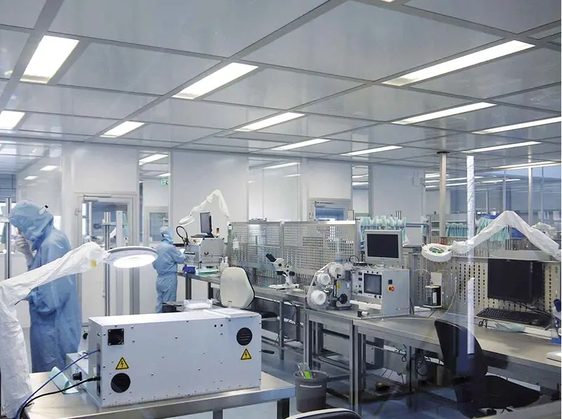 千级净化车间广泛应用于光学制造、LED产品生产、照明灯具、线路板、镜头镜片生产、光学仪器生产研发等领域。建设千级净化车间常使用于装配式车间厂房,安装较为简便,且质量稳定。而且千级净化车间较机动灵活,既适合在新建厂房配套安装,也适宜旧洁净无尘车间厂房的净化技术改造中使用。千级净化车间需要辅助的建筑面积较小,对土建装修方面要求低。